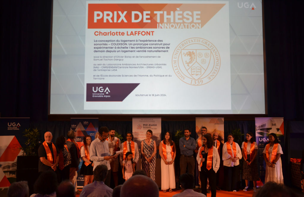 📙 Ce prix récompense l’ensemble de son travail de thèse intitulé « La conception du logement à l’expérience des sonorités – COLEXSON. Un prototype construit pour expérimenter à échelle 1:1 les ambiances sonores de demain depuis un logement ventilé naturellement ». Cette thèse menée sous la direction d’Olivier Balaÿ (AAU-CRESSON) et encadrée par Samuel TOCHON-DANGUY via une convention ANRT-CIFRE au LASA a été soutenue le 18 juin 2024.