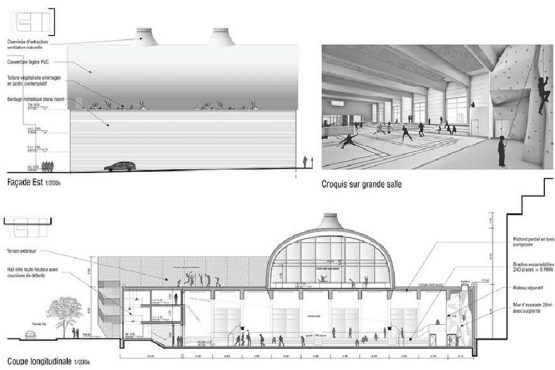 Dans le cadre de la reconstruction du lycée Brossolette : construction d’un complexe sportif polyvalent sur plusieurs étages, composé notamment d’une salle principale de 1 600 m² avec mur d’escalade de 9m de haut, d’une salle secondaire divisible, d’un terrain extérieur en toitures…