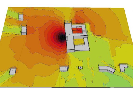 Mission d’assistance technique en acoustique à la maîtrise d’oeuvre : étude de l’impact du bruit généré dans le voisinage par les équipements techniques du projet. Mesures acoustiques initiales. Modélisation acoustique 3D du bruit dans l’environnement.