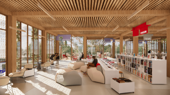 Construction d’une nouvelle médiathèque en lieu ouvert (matériaux biosourcés) comprenant des salles de travail, des espaces de consultation ouverts – collections littérature, jeunesse, espace de création numérique, auditorium, salles d’expositions, café, toit-terrasse,… autour d’une agora centrale. Façades en parement de pierre, structure poteau-poutre bois, plancher mixte bois en superstructure.