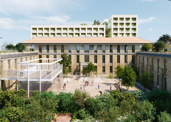 Réhabilitation du bâtiment PINARD, ZAC Saint-Vincent-de-Paul (14ème arrondissement), en équipement mutualisé : crèche (66 berceaux), groupe scolaire (8 classes), gymnase et espaces partagés.
